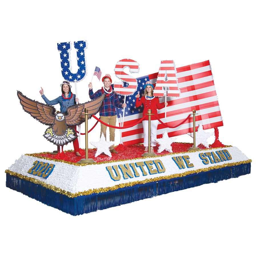 The American Flag on Stand Parade Float Kit helps give a dash of patriotic color to any Fourth of July, Memorial Day, or Veteran's Day float. Made from printed cardboard and wood base, with additional decorations (white and red floral sheeting).